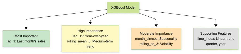 Automatic feature selection: You create 18 potential predictors, but only 7 actually improve forecasts. XGBoost’s feature importance reveals which variables drive your business—insight as valuable as the predictions themselves.