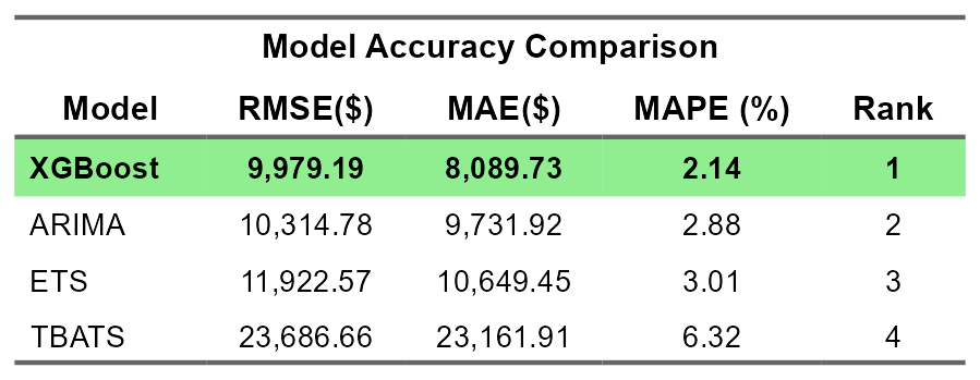 After comparing traditional statistical methods (ARIMA, ETS, TBATS) and machine learning (XGBoost), the accuracy rankings tell a clear story: