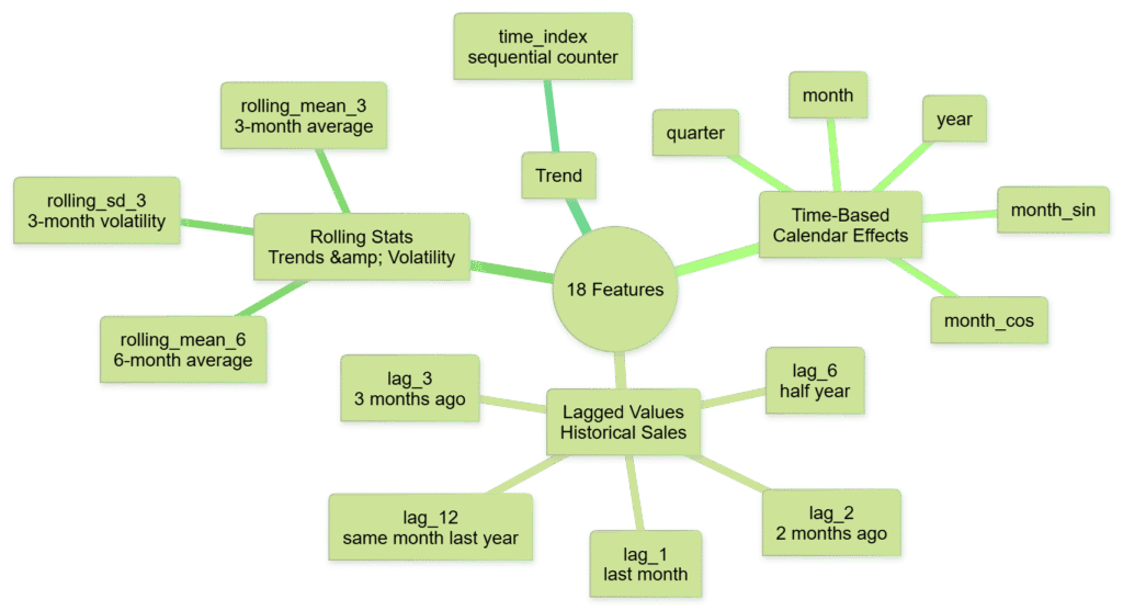 In the end, we need to prepare 18 features as the diagram shows. These features span four distinct categories, each capturing different aspects of your sales patterns. Time-based features encode calendar effects—the cyclical nature of months and quarters that drive seasonal demand. Lagged values preserve historical context, letting the model learn from recent momentum (lag_1, lag_2) and year-over-year patterns (lag_12). Rolling statistics reveal trends and volatility: 3-month and 6-month averages smooth out random fluctuations, while standard deviation measures uncertainty in recent performance. Finally, a simple time index captures linear growth or decline in your business over time. This combination of engineered features transforms raw monthly sales figures into a rich representation that XGBoost can learn from effectively.