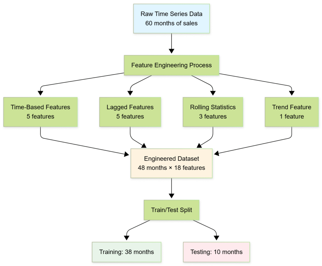 To wrap up the process for the preparation, we need to follow the workflow shown in the diagram above. The result is a machine learning-ready dataset where each observation is enriched with temporal patterns, historical context, and trend indicators that enable accurate predictions.