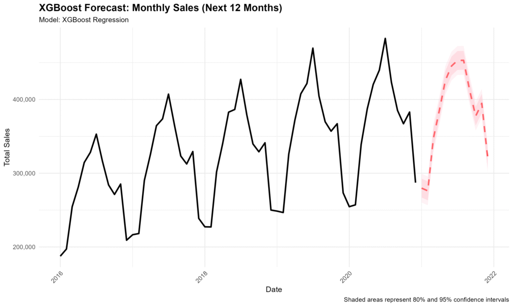 Machine learning sales forecasting with XGBoost doesn’t assume these patterns—it discovers them. By creating 18 engineered features from historical data and letting gradient boosting trees find complex relationships, one electronics retailer improved forecast accuracy beyond what traditional ARIMA models achieved.