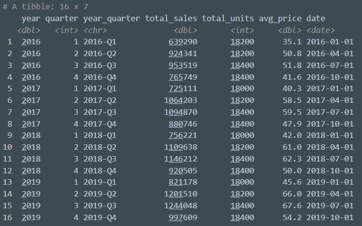 The tibble on the right figure is transformed from 60,000 individual transactions into the first 20 monthly observations out of 60:
